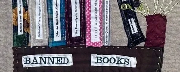 Cotton linen base with appliquéd fabric book spines, hand-embroidered text, stitched bookshelf, and button-embellished flowers, combining textile collage, embroidery, and mixed-media quilting techniques.
