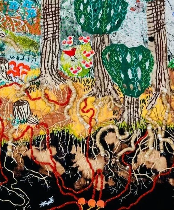 Mixed media on fabric. This piece uses hand-stitched embroidery, appliqué, and fabric paint. The layered textures depict trees with details, framed by a green fabric border.