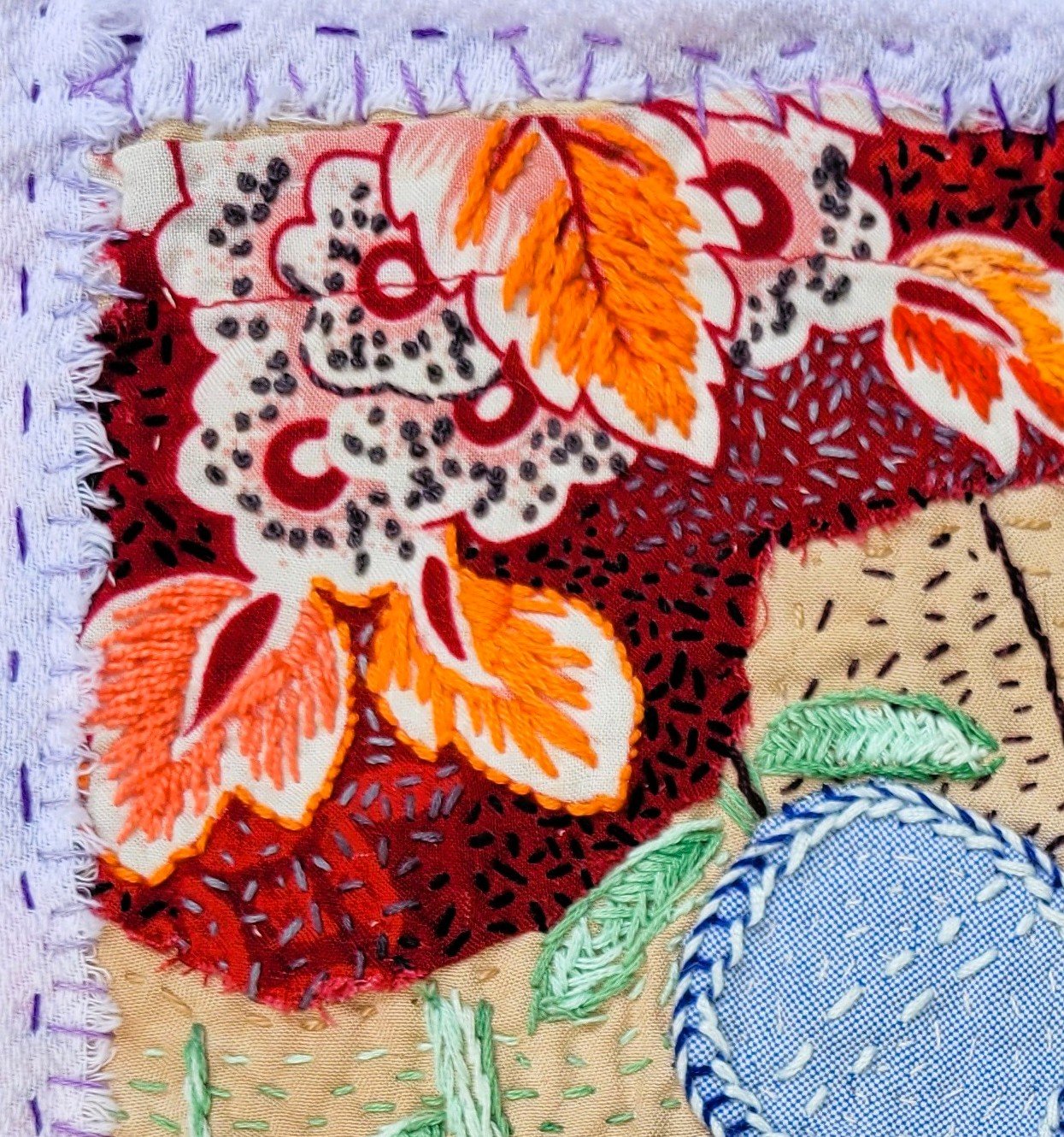 Cotton fabric and thread. Pieced and appliquéd with geometric shapes and hand embroidery.