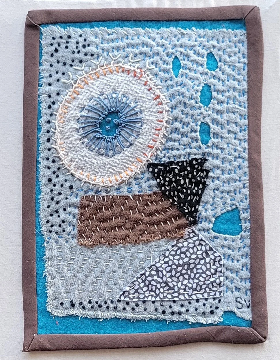 Fabric and cotton thread are used in this piece, featuring stitched geometric shapes and patterns. A prominent circular form is created through reverse appliqué, complemented by embroidery techniques such as seed stitch, running stitch, and French knot stitch.