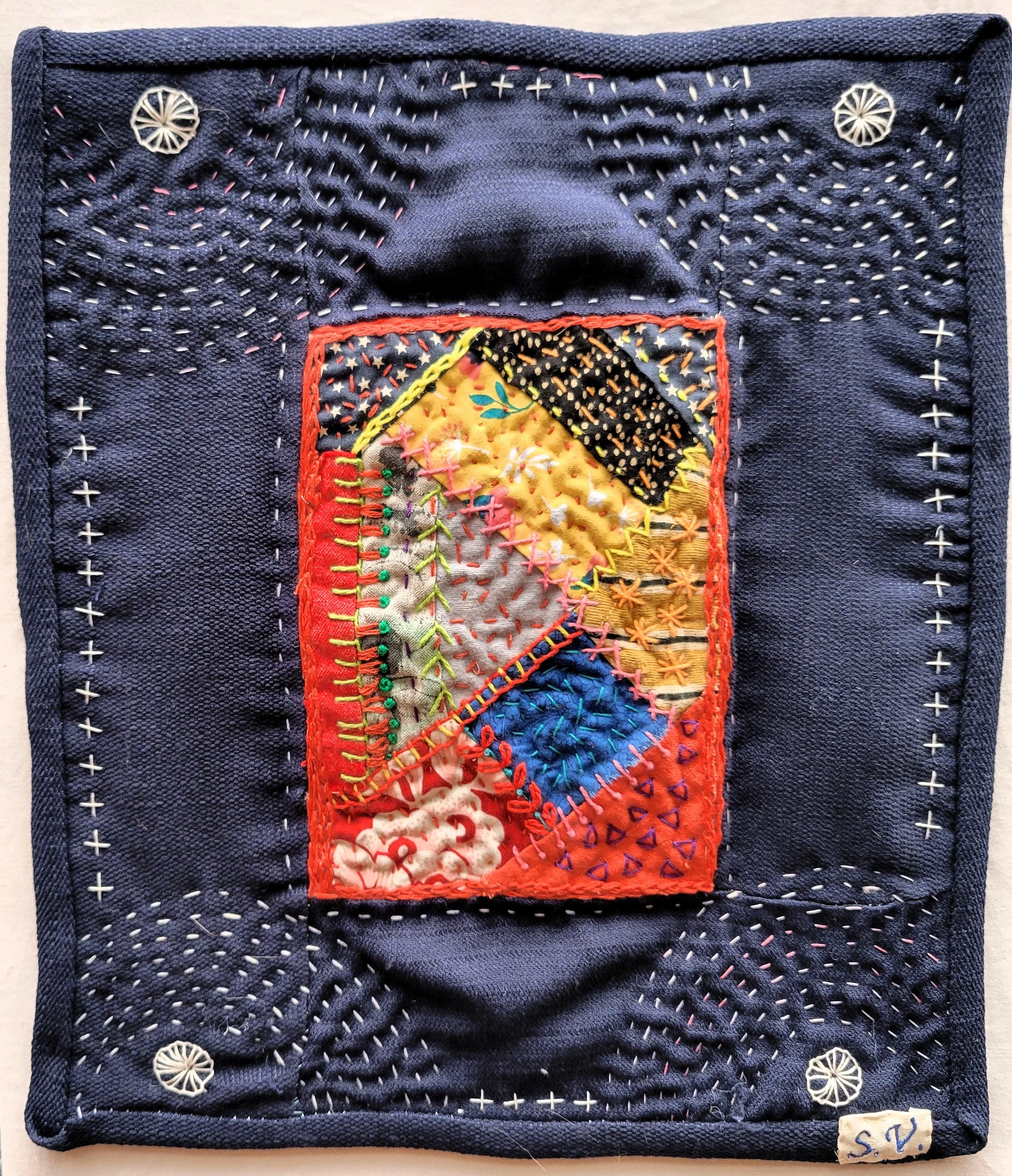 Cotton fabric and thread. Pieced and appliquéd with geometric shapes and hand embroidery.