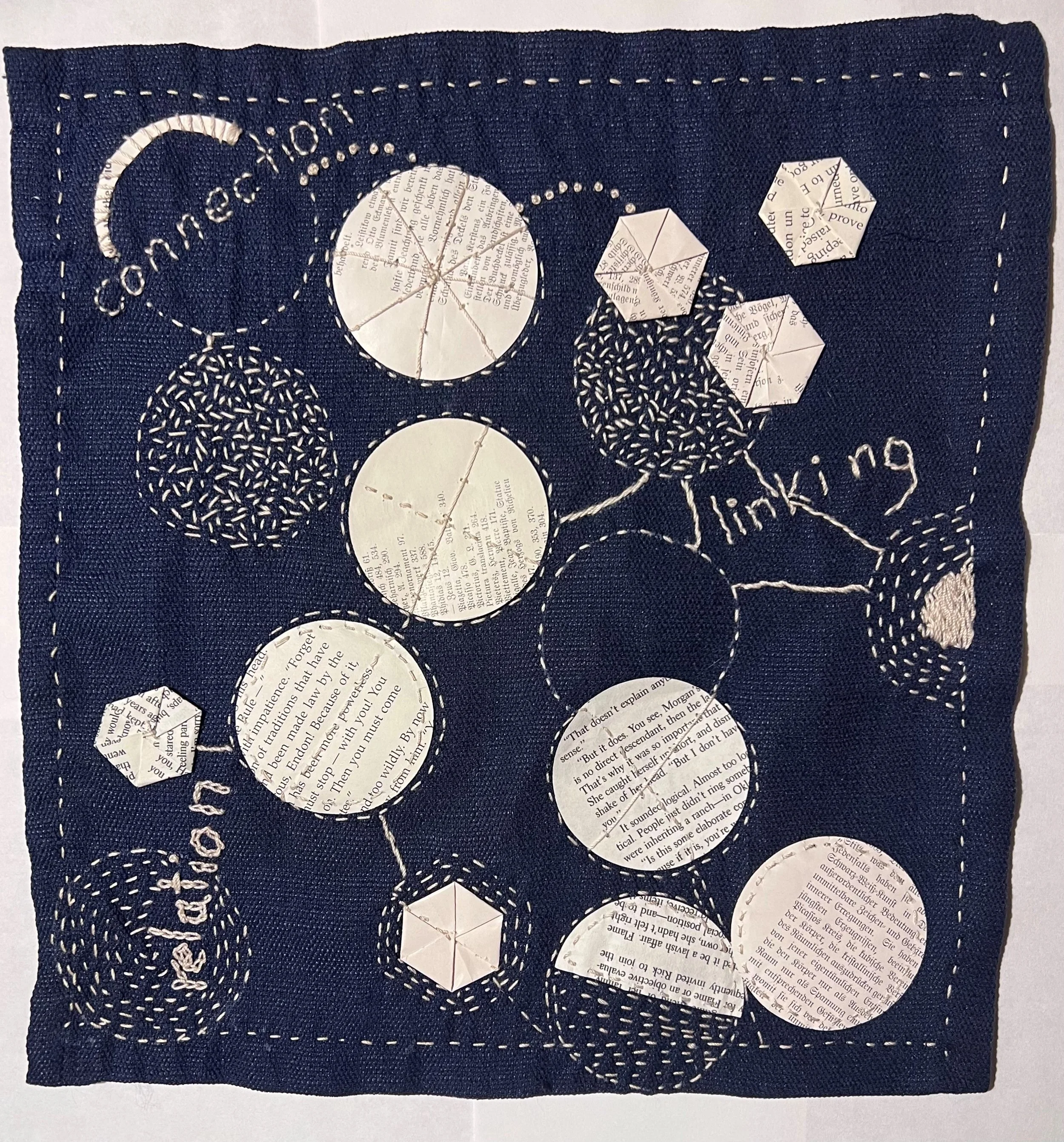 Fabric, paper, and thread are used in this piece. Circles of paper, featuring visible text, are stitched onto a fabric background. Recycled materials, including book pages and curtain fabric, are incorporated. Appliqué origami shapes are complemented by surrounding embroidered patterns.