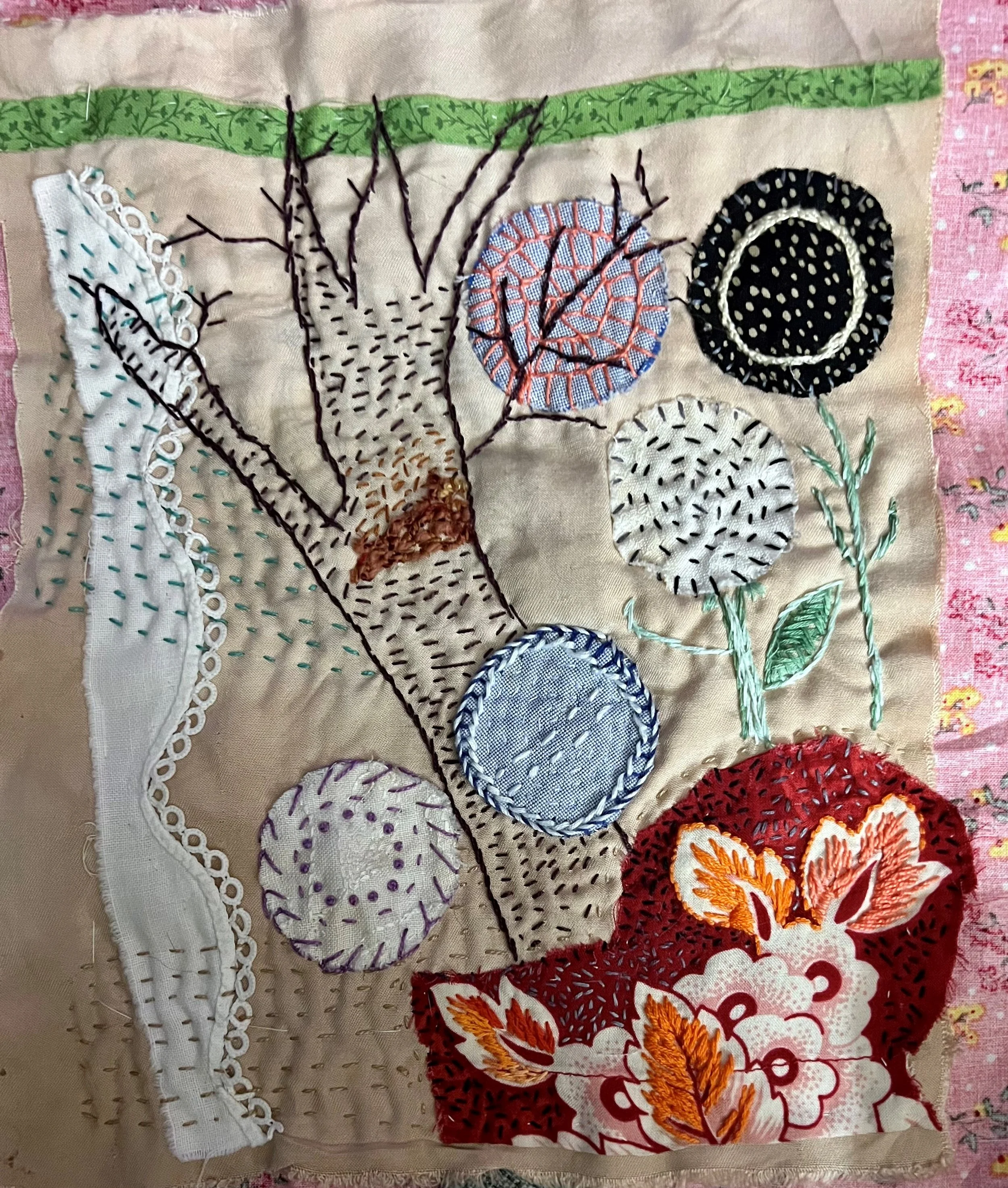 Fabric, thread. Hand-stitched quilt block featuring various fabric pieces joined together with decorative stitches.