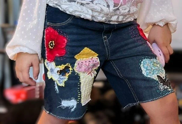 Handcrafted denim shorts with vibrant appliqués, embroidery, and stitched details, featuring flowers, butterflies, and an ice cream motif for playful charm.
