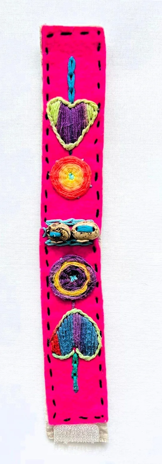 Handcrafted textile bracelet featuring bold embroidery, stitched heart motifs, seed bead accents, and vibrant colors, blending tradition with artistic expression.