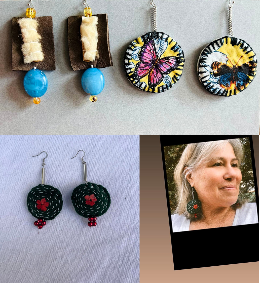 Handcrafted earrings featuring fabric, embroidery, beads, and leather, showcasing butterflies, floral motifs, and textured details for a unique artistic statement.