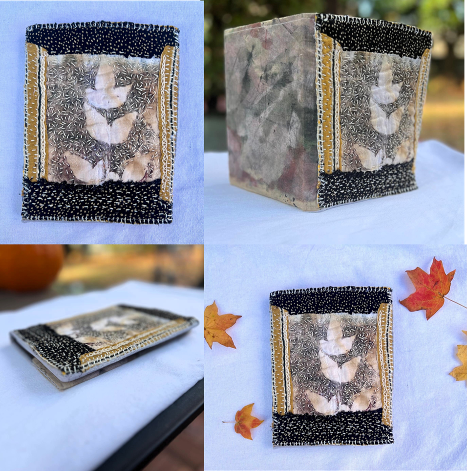 Cotton fabric, appliqué, and hand-stitched embroidery using cotton thread. Incorporates reverse appliqué and dense stitching techniques such as seed stitch, running stitch, and French knots, creating a textured, layered composition with intricate borders.