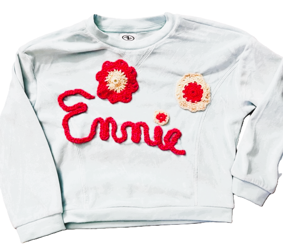 Cozy sweatshirt featuring handcrafted crochet floral appliqués and bold embroidered lettering, blending texture, warmth, and artistic charm in a unique statement piece.