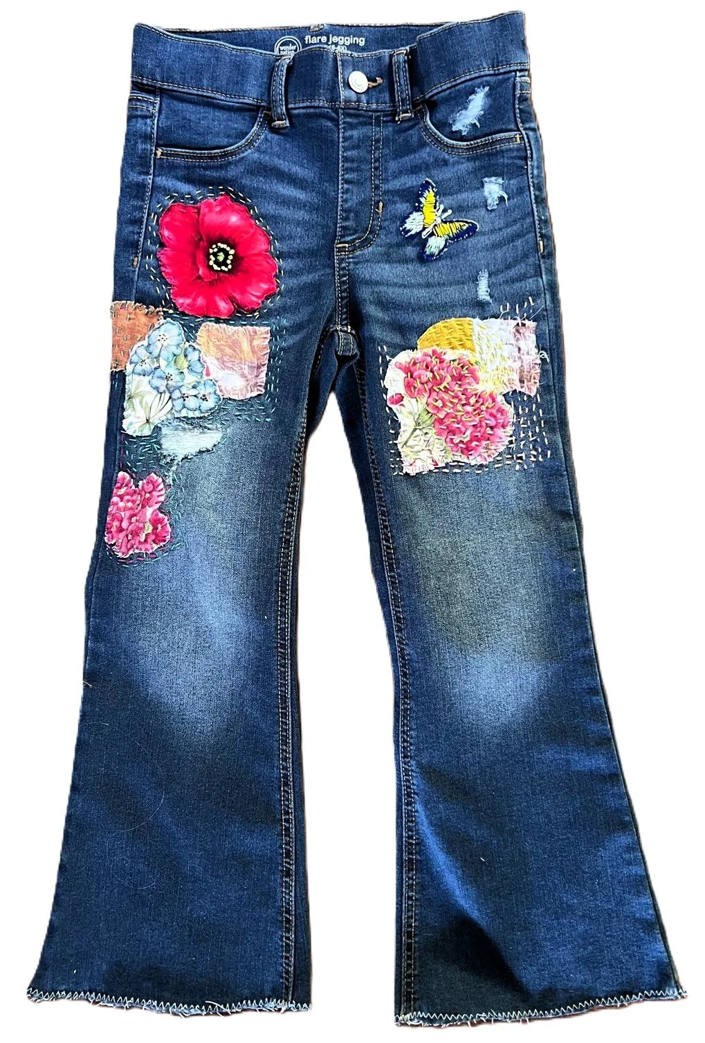 Denim base with vibrant fabric appliqués, embroidered floral patches, textured cotton prints, stitched details, and accent stitching enhancing artistic flair.