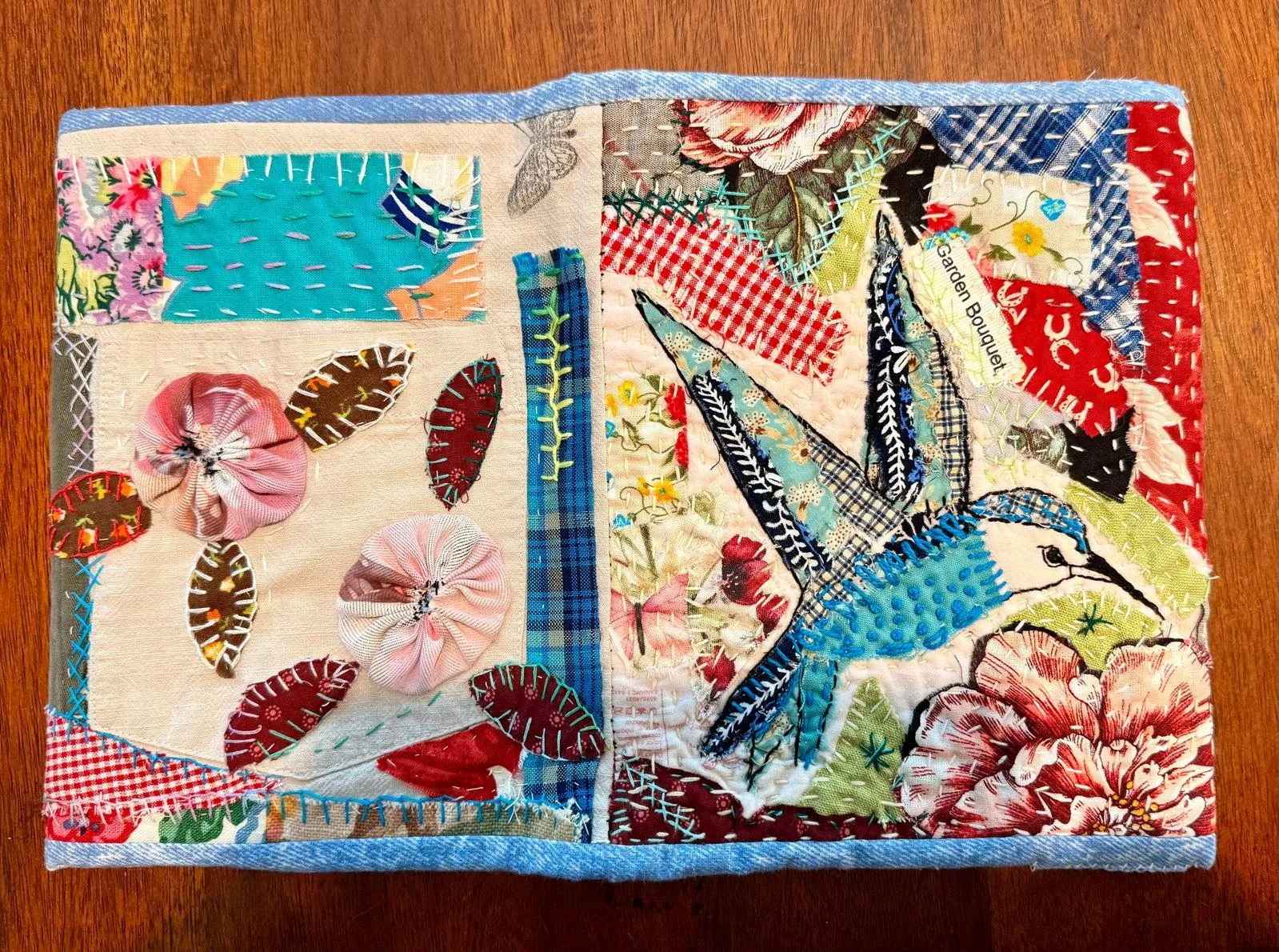 Picaflor Garden Journal cover. Featuring a vibrant hummingbird, yo-yo flowers, embroidered leaves, and layered fabrics, celebrating texture, memory, and garden-inspired storytelling through hand stitching.