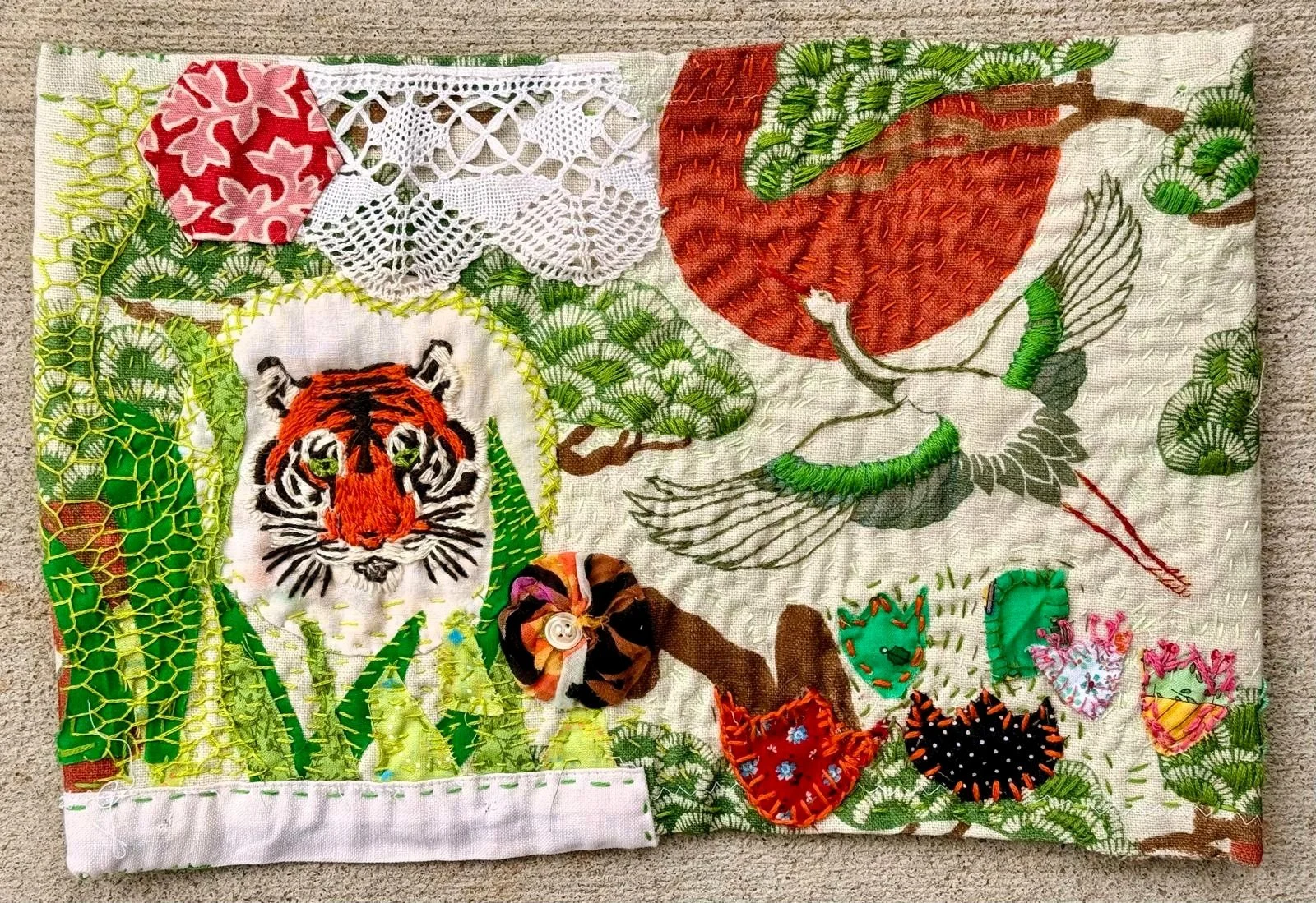 Tiger and Crane Garden Journal cover featuring embroidered tiger portrait, flying crane, textured foliage, lace accents, and layered appliqué, blending nature symbolism with intricate hand-stitched storytelling.