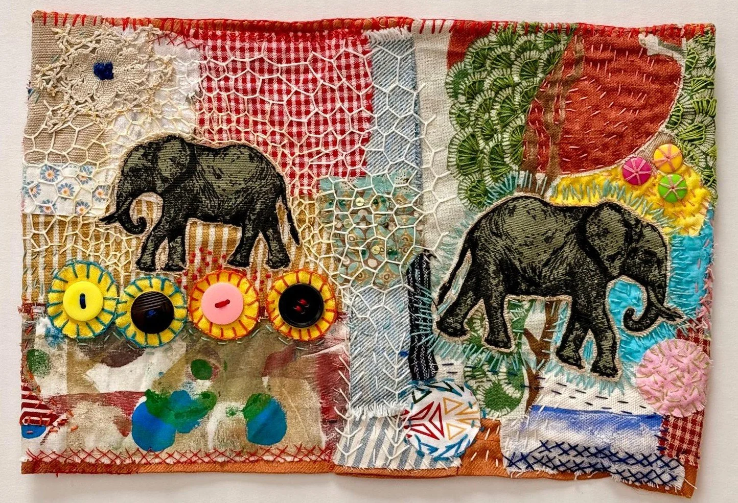Éléphants en Voyage journal cover featuring appliquéd elephants, lace overlays, colorful buttons, and layered textiles, combining playful movement with richly textured hand-stitched surfaces and narrative depth.