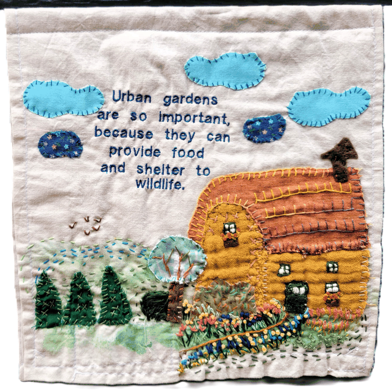 Flag 2 Side 2: combines appliqué, embroidery, and hand-painting. It features satin stitches, running stitches, and French knots to depict a cottage, garden, and embroidered text promoting urban gardens for wildlife.