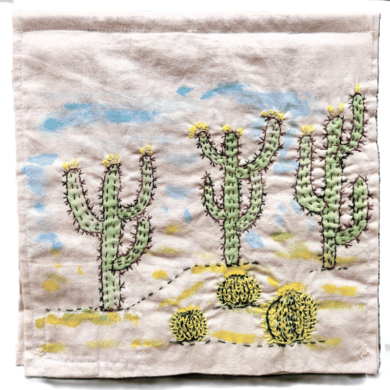 Flag 3 Side 1: features hand-painted fabric with embroidered cacti using satin stitches, French knots, and stem stitches. Delicate threadwork enhances textures, creating a desert landscape with blooming details.