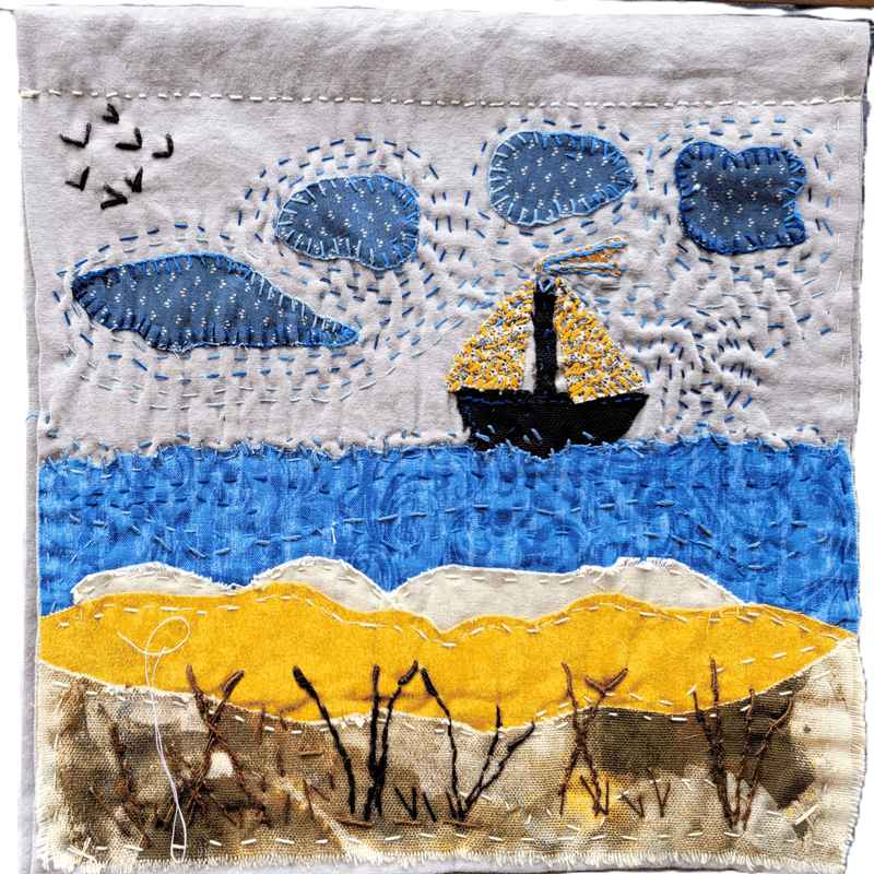 Flag 4 Side 1: appliqué, embroidery, and layered fabric textures. Running stitches, French knots, and couching create movement in the water, sky, and sailboat, enhancing the maritime landscape.