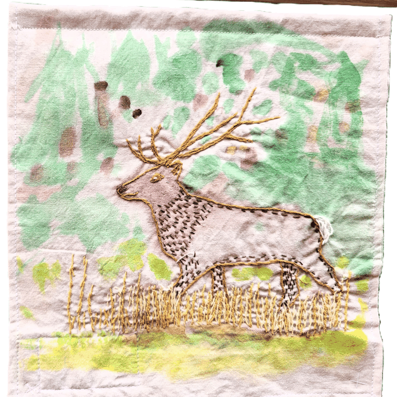 Flag 5 Side 2: hand-painted fabric with embroidered details. Stem stitches, French knots, and running stitches create the deer, antlers, and grass, blending textures for a dynamic woodland scene.