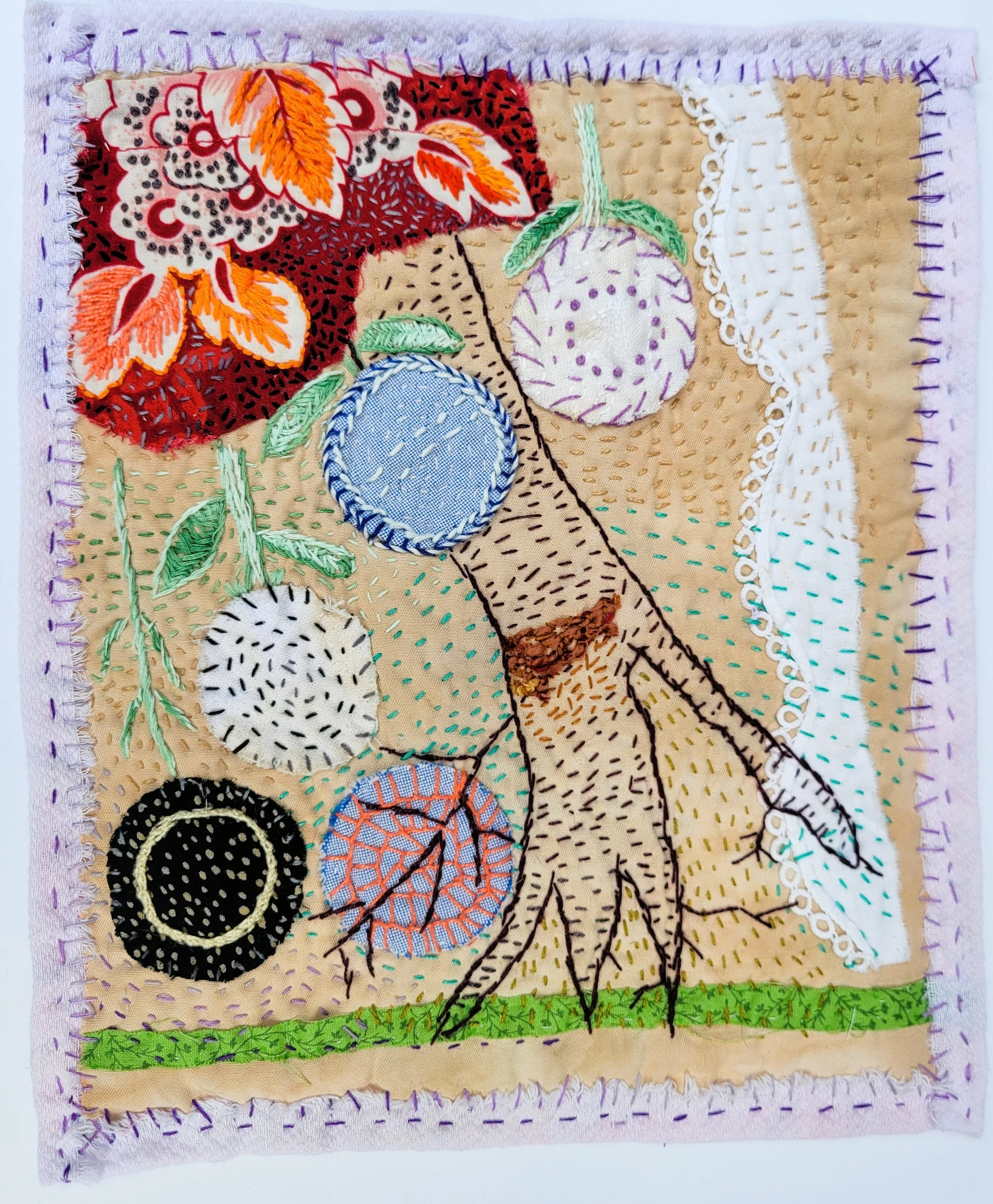 Recycled fabric, appliqué, and handstitched. Different embroidery stitches were added to create depth.