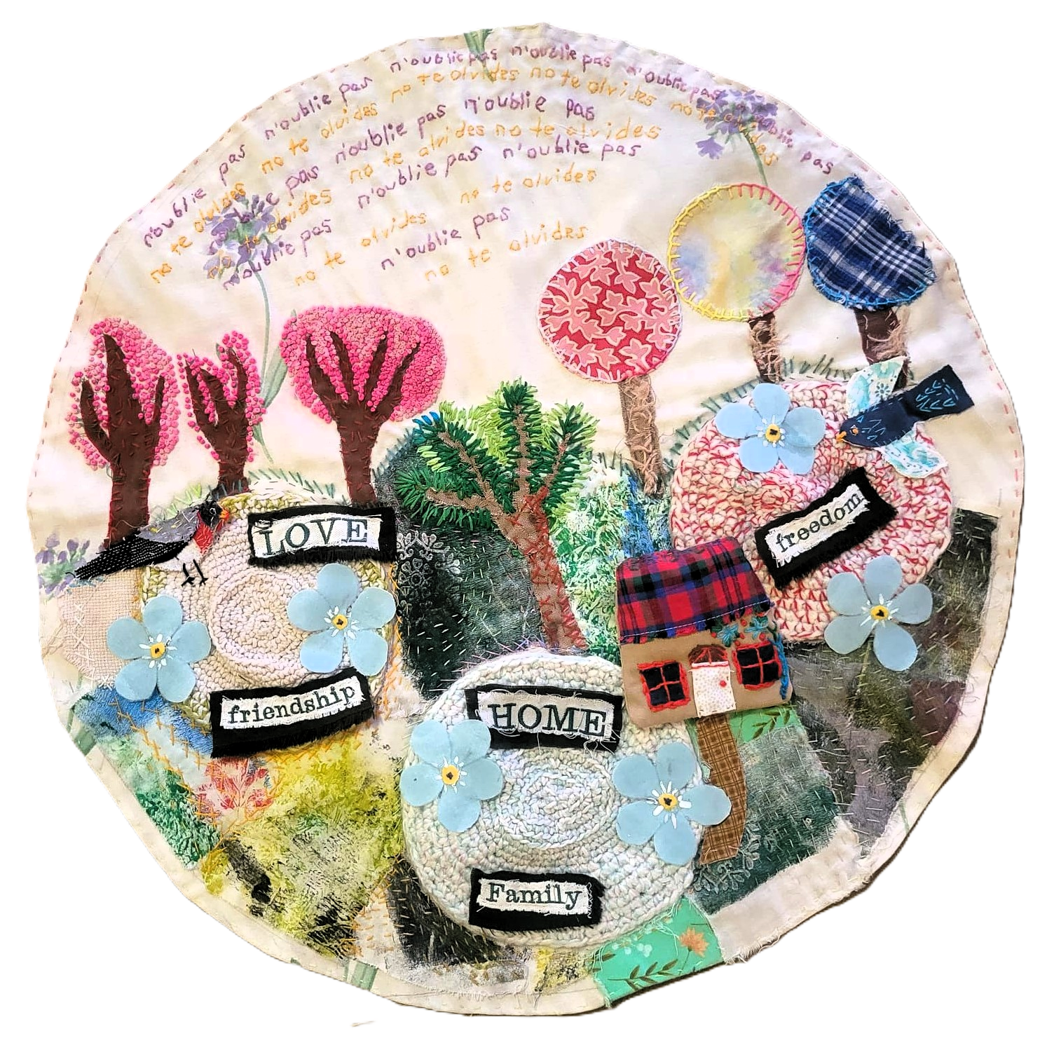 Mixed media. Recycled materials, painted cotton with acrylic. Hand-stitched quote on fabric and embroidered.