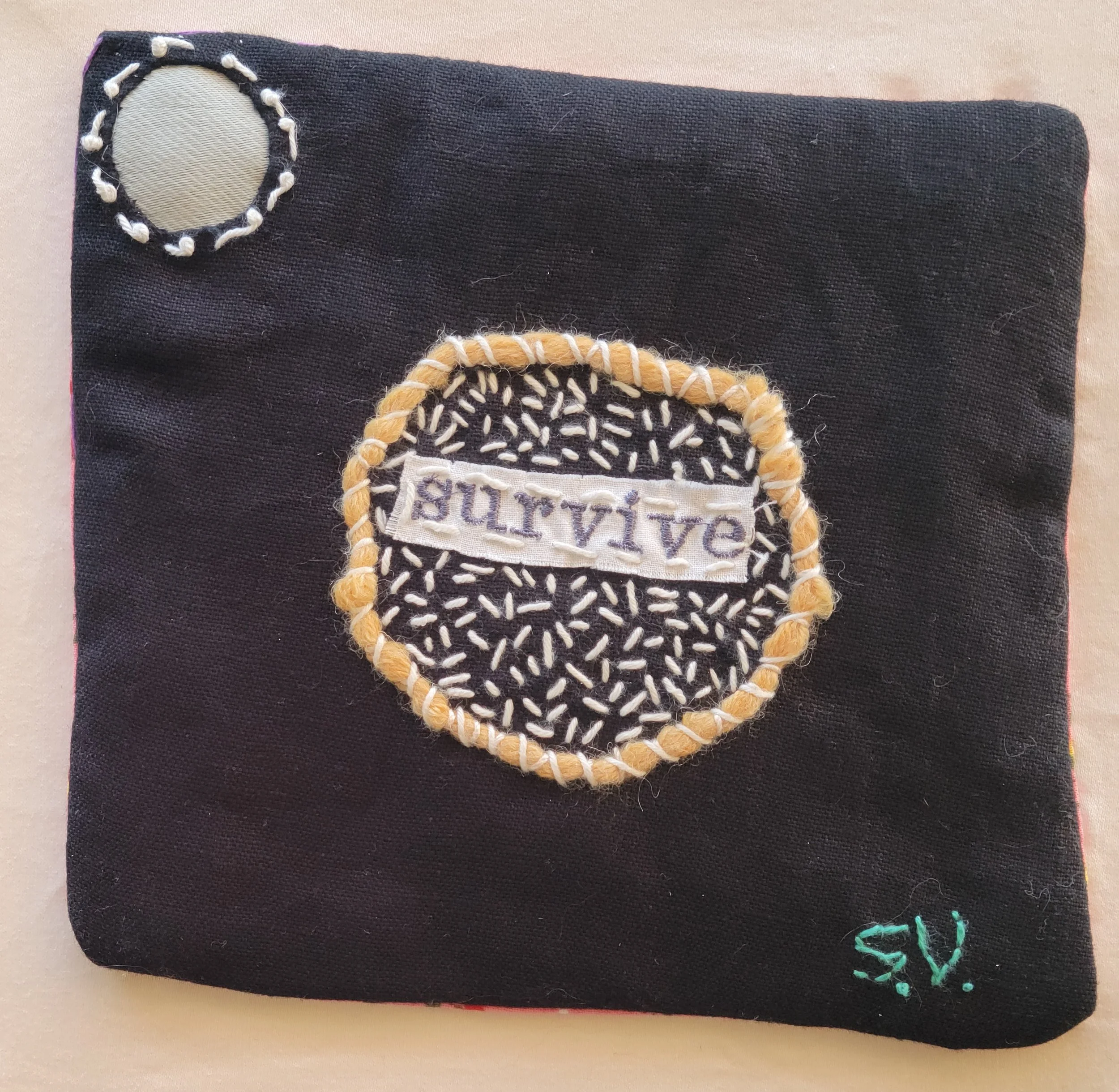 This piece was created using cotton fabric, with hand-stitched embroidery in white and gold threads. The word "survive" is appliquéd onto a black background, surrounded by detailed seed stitching and outlined in a circular gold border, all against a black fabric base.
