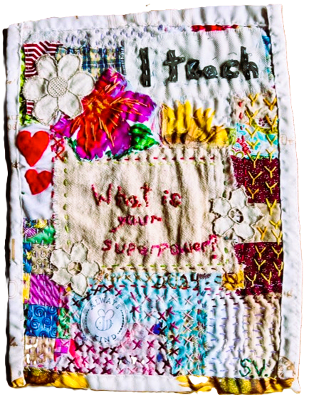This quilt combines hand embroidery, appliqué, patchwork, and vibrant stitching with textual and floral motifs, celebrating teaching as a superpower.