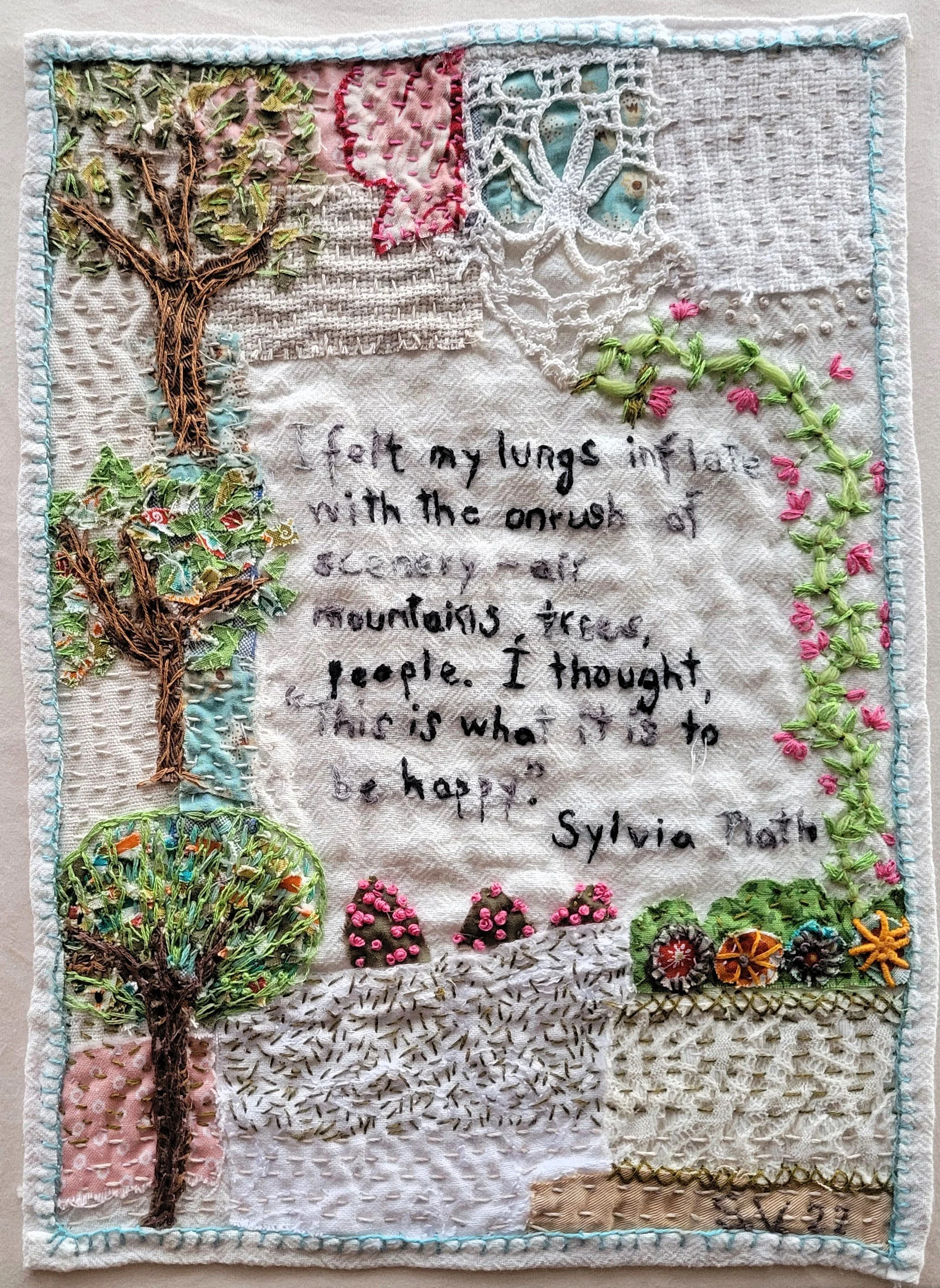 Recycled fabric, lace, and cotton thread. Hand-stitched and embroidered, featuring a quote by Sylvia Plath: 'I felt my lungs inflate with the onrush of scenery—air, mountains, trees, people. I thought, This is what it is to be happy.'