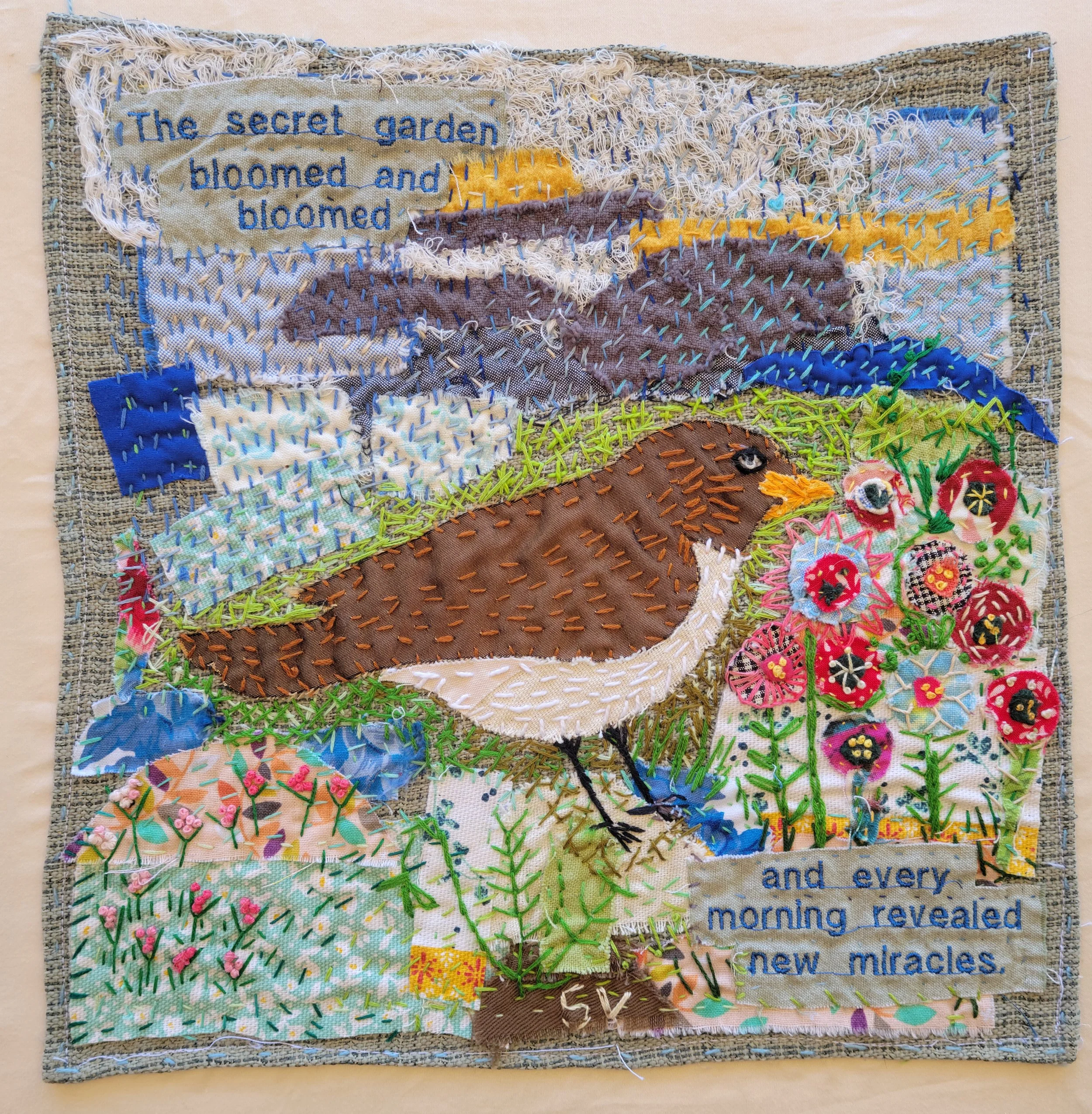 Recycled fabric, appliqué, and hand-stitched embroidery using cotton thread. The techniques include fabric layering and intricate embroidery stitches. The quilt features a quote from Frances Hodgson Burnett's novel The Secret Garden: 'The secret garden bloomed and bloomed, and every morning revealed new miracles.'