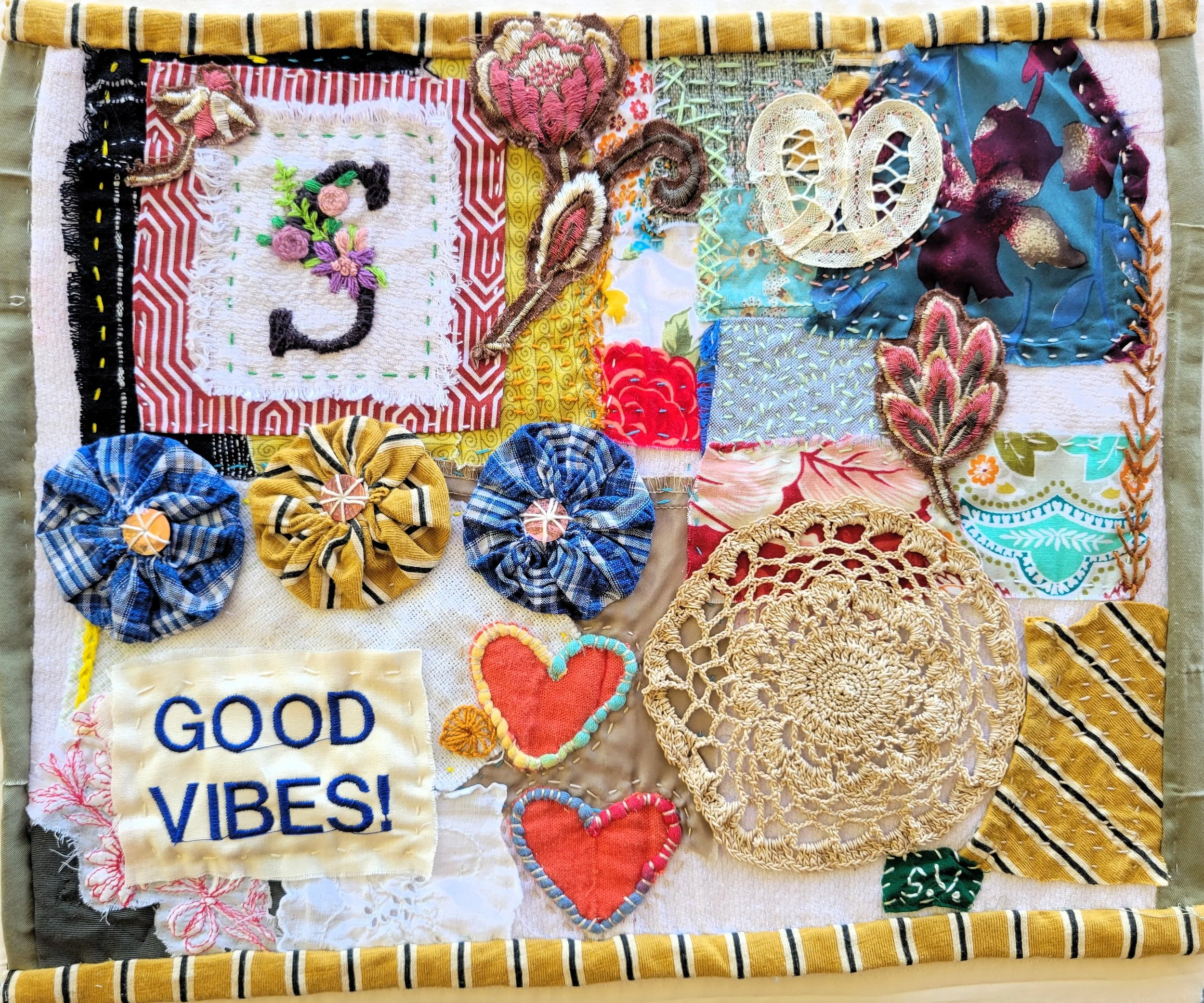 Mixed media, lace, and hand-stitched embroidery. This piece incorporates appliqué, yo-yo quilting, crochet doilies, and various textured elements.