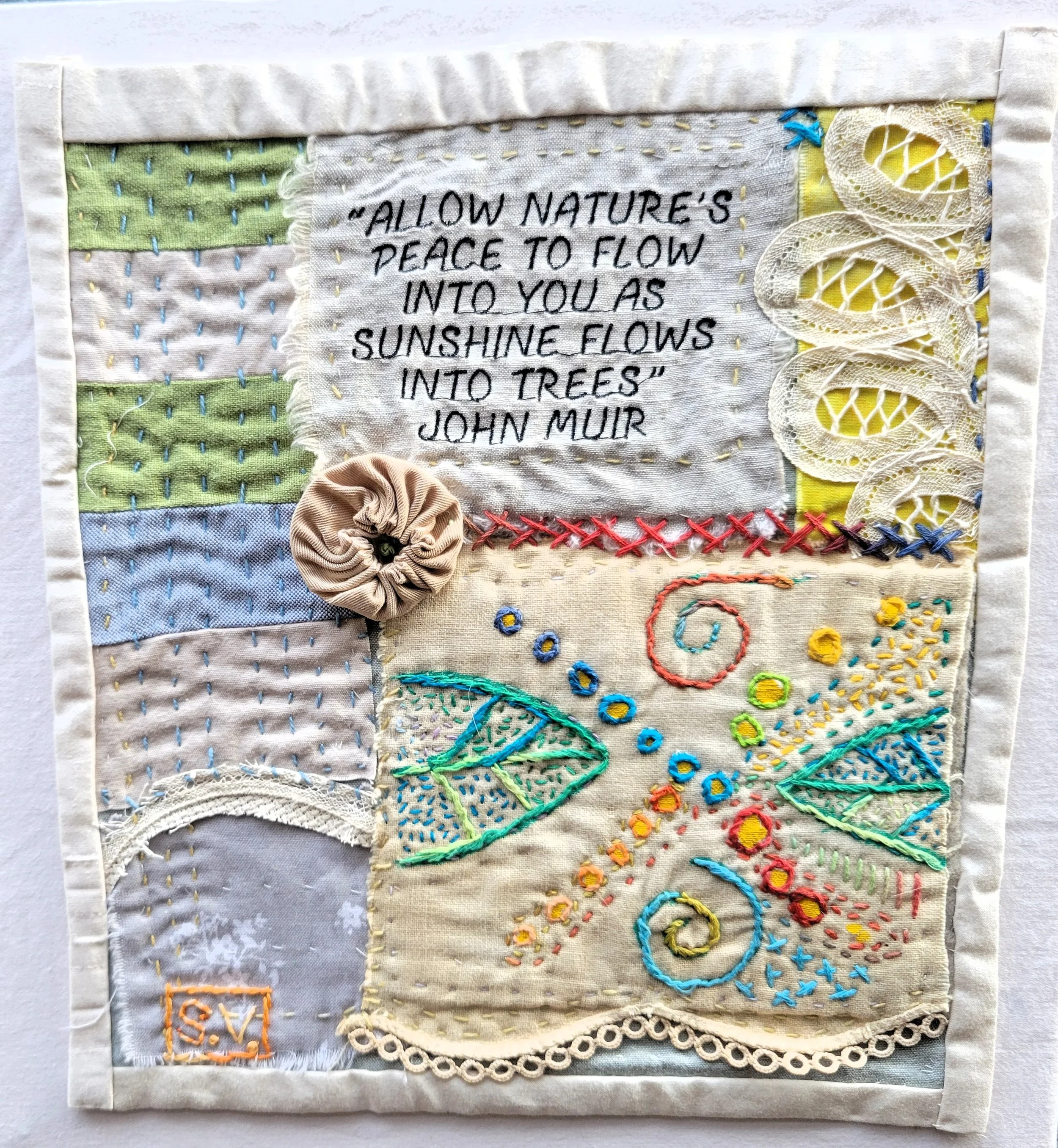 This piece is created using a combination of fabrics with hand-stitched embroidery and appliqué techniques. It includes a quote from John Muir, lace accents, and various textured elements, forming a composition that integrates text and decorative stitching.
