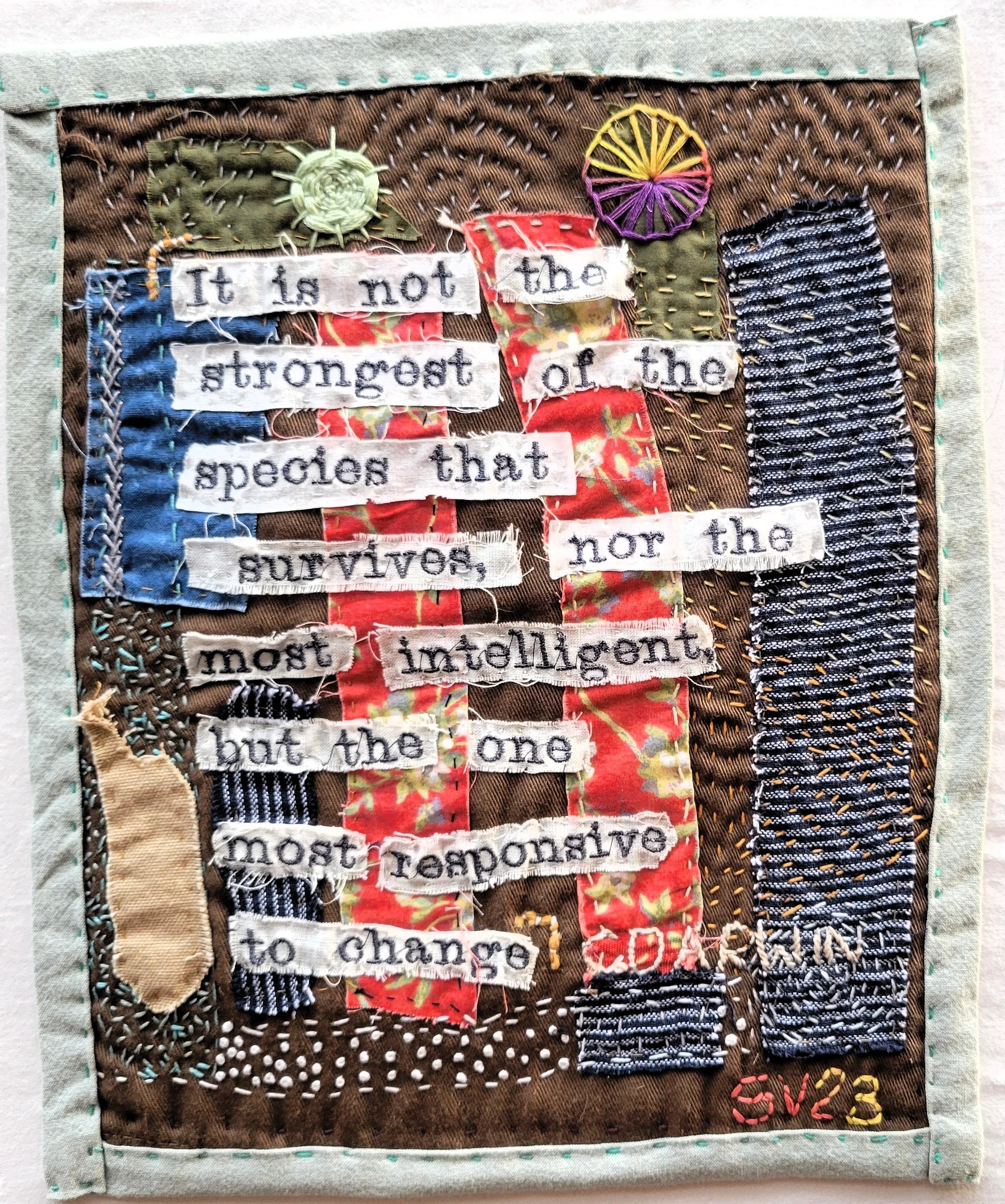 Cotton fabric, appliqué, and hand-stitched embroidery using various thread types. The piece features a quote by Charles Darwin, with fabric strips and layered stitching.