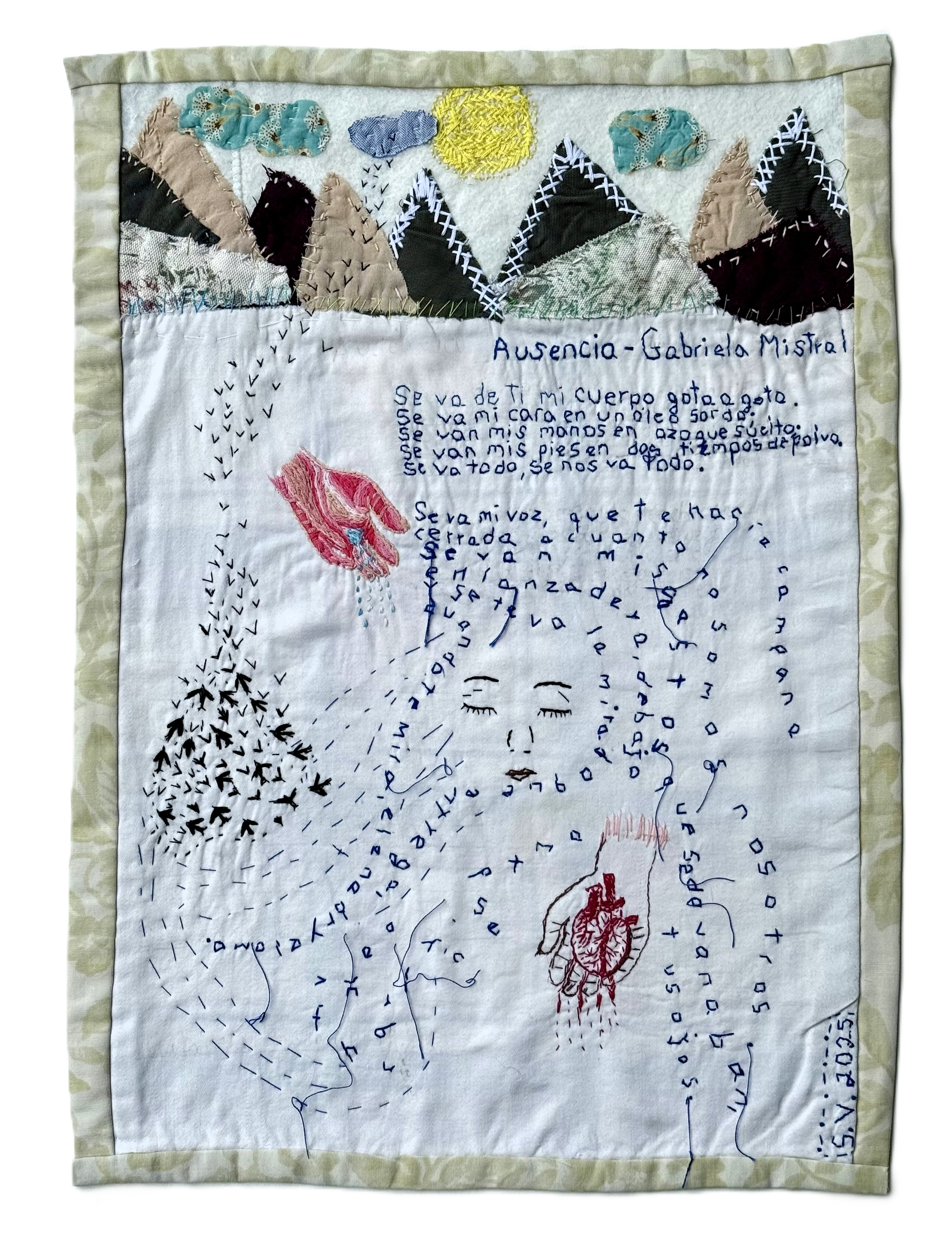 Cotton and linen with hand embroidery using cotton threads, textile appliqué, and freehand stitched text; hand quilted to integrate composition, relief, and precise artisanal detailing throughout the piece.