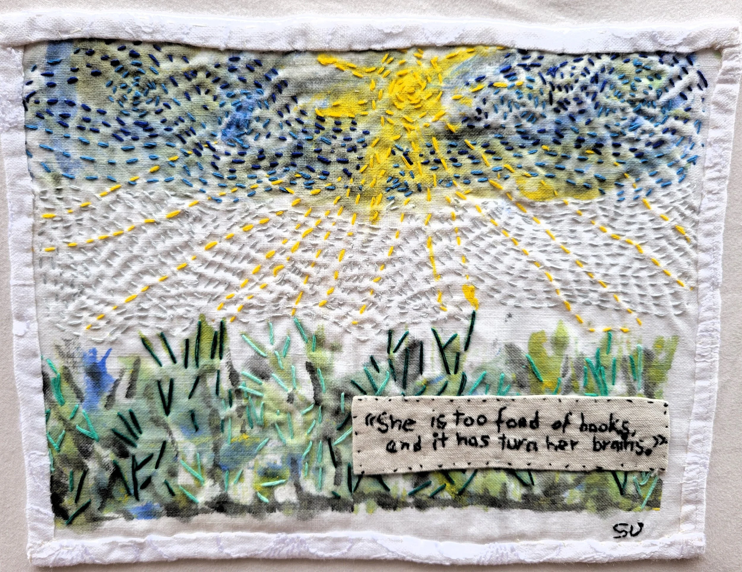 Combination of hand-stitched embroidery and acrylic painting on fabric, featuring a nature-inspired design with textual elements.